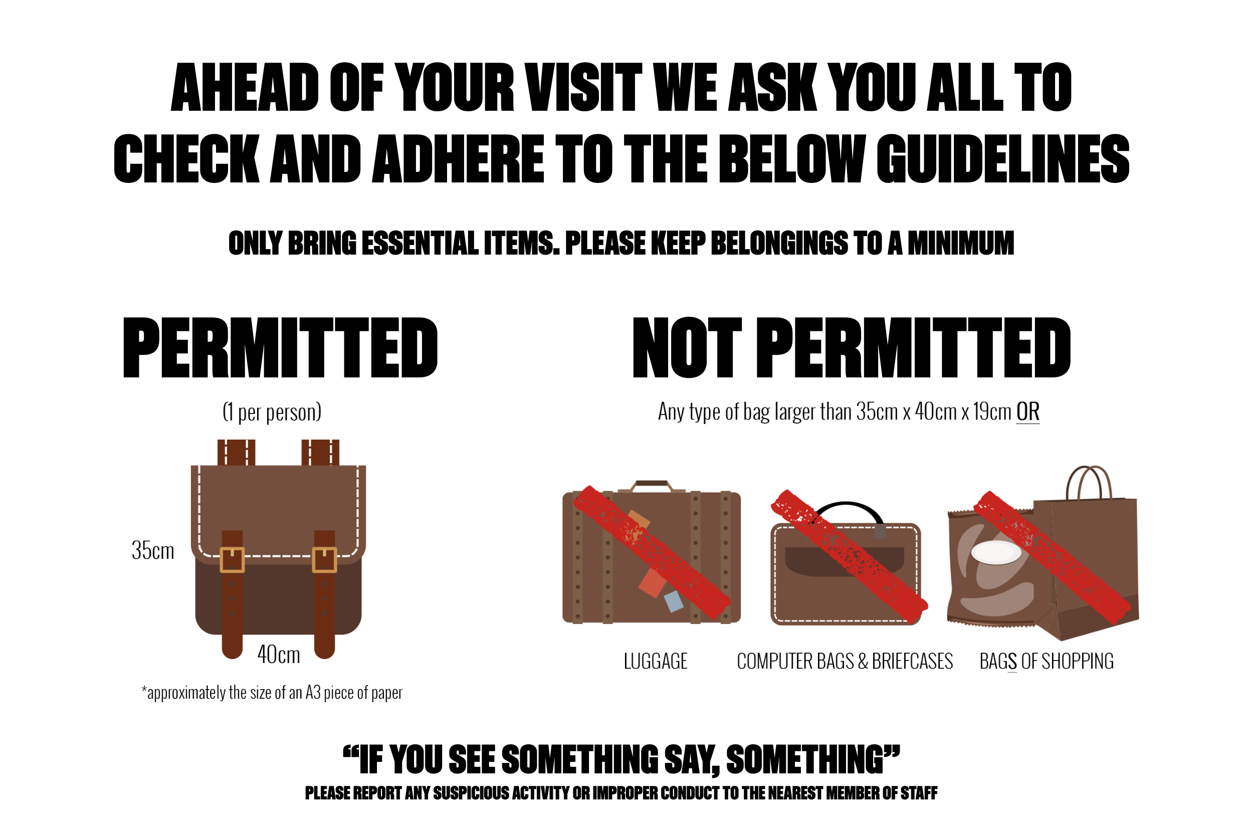 - Bags larger than 35cm x 40cm x 19cm will not be permitted